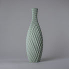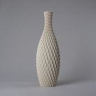 Kenmerken: golvende oppervlaktestructuur, organische textuur, elegante vorm, slanke hals, fijn geribbelde textuur, gelaagde opbouw, matte afwerking, lichtgewicht, dunwandig maar robuust, smalle halsopening, subtiel schaduwverloop.