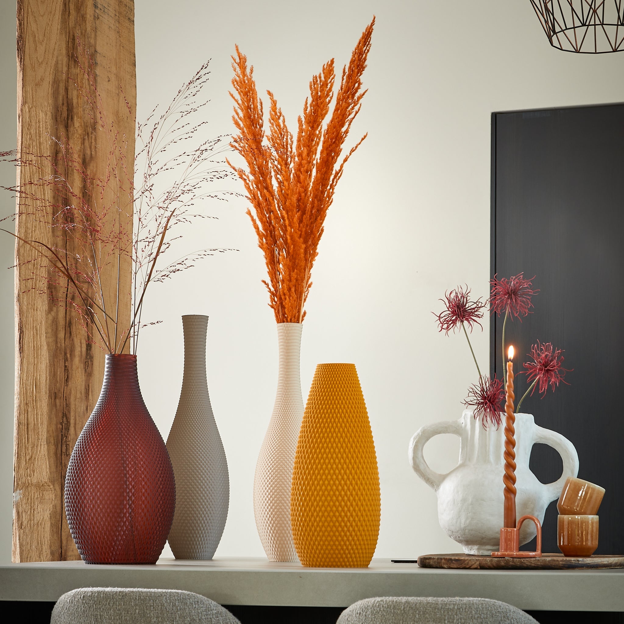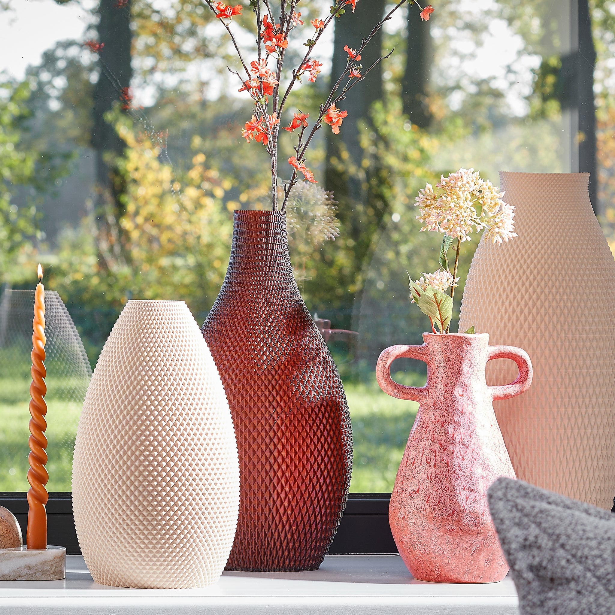 QUARTZ is versatile. Whether you place it on the table as a centrepiece, on your dresser as an eye-catcher, or on your windowsill as an accent, it turns any place into a stylish whole. The vase is made of 100% recycled plastic from food packaging, combining sustainability with design. The 3D printing process gives the vase its distinctive details and special layered texture.