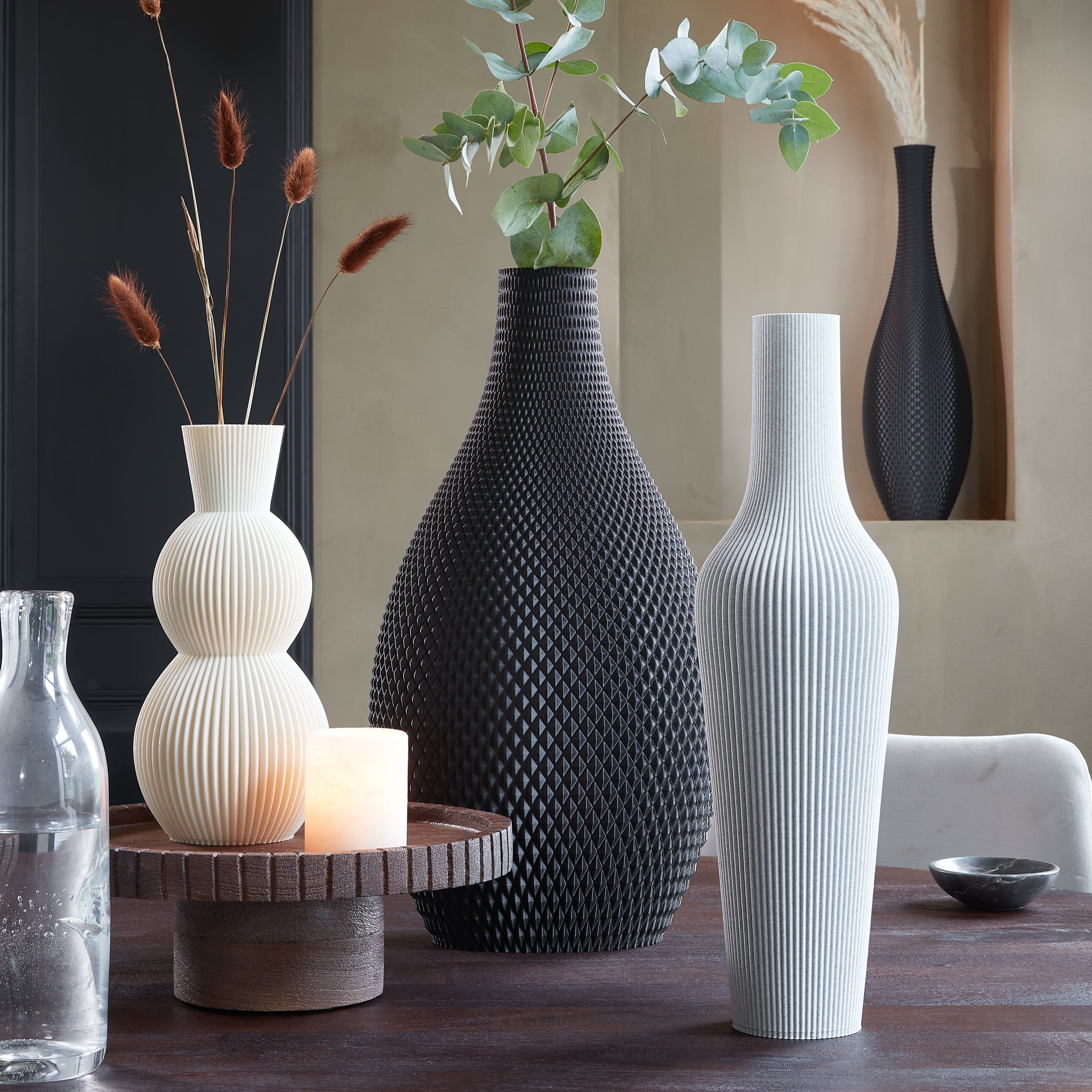 I make all the vases from recycled PLA (rPLA) sourced from post-industrial plastic packaging waste. This includes items like food containers, bottles, and other plastic packaging that would otherwise be destroyed.